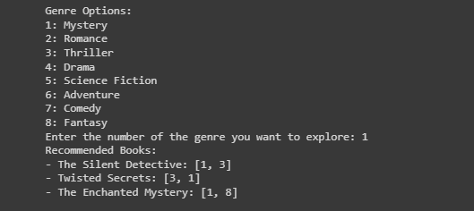 In a generic context, a user profile is created, and the user is matched with items that align with their profile. For this example, we will use basic user input to simulate a customer profile. Numerical genre mapping will be used, corresponding to selective book titles.